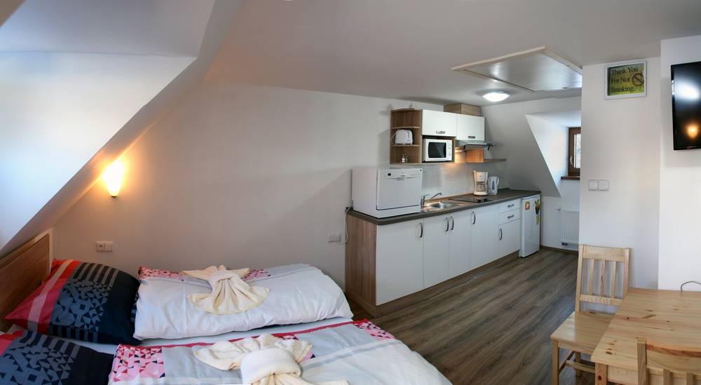 Každý apartmán má svou vlastní koupelnu, TV s radiem a budíkem, WC, kuchyňskou linku vybavenou nádobím a příbory, chladničku, sklokeramickou desku, mikrovlnnou troubu, toastovač, rychlovarnou konvici, dále je k dispozici dětská postýlka, dětská židlička, dětský příbor, dětské sedátko na wc, stupátko pod umyvadlo, trezor, fén, připojení WIFI.