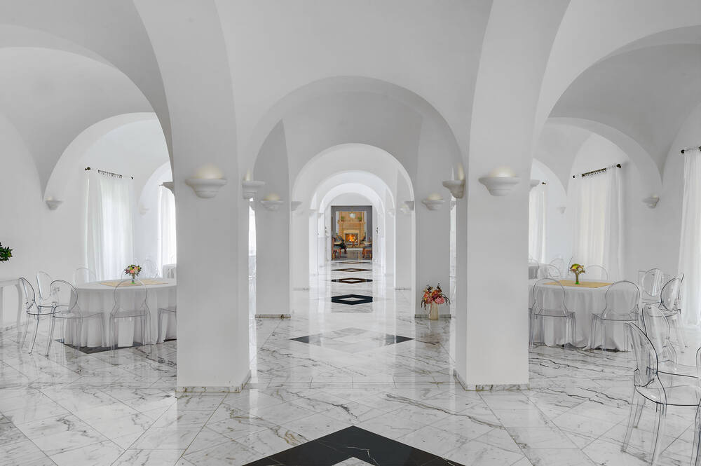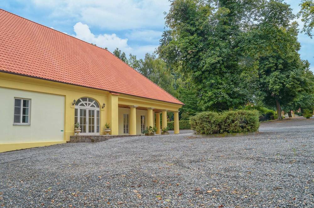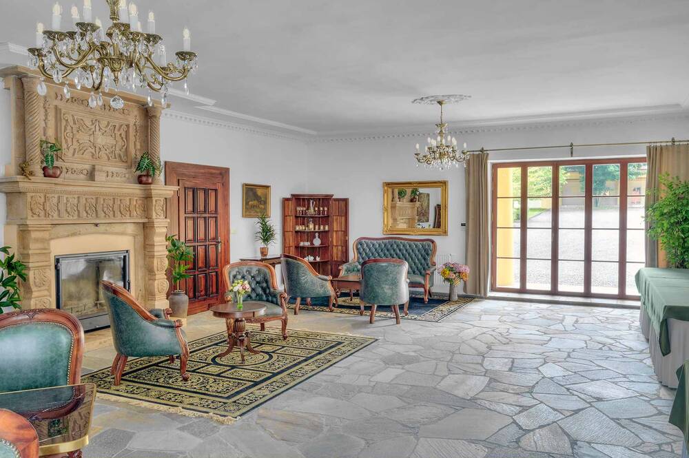 Zámecké prostory nabízejí komfortní zázemí včetně luxusního inventáře - vstupní halu, klenbový sál, salónek s krbem, bar, ložnice, relaxační komnatu, ale také venkovní zastřešenou terasu se sloupovím, která je ideální pro odpočinek s výhledem na nádvoří a park.