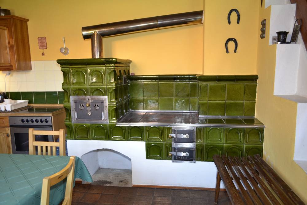 V kuchyni je k dispozici myčka na nádobí, veškeré kuchyňské vybavení (elektrický sporák, trouba), rychlovarná konvice, kávovar a chladnička a kachlový sporák na dřevo s troubou.