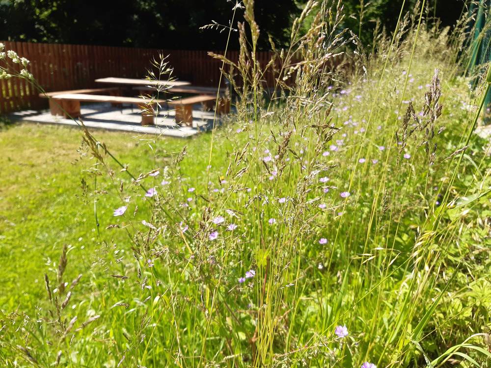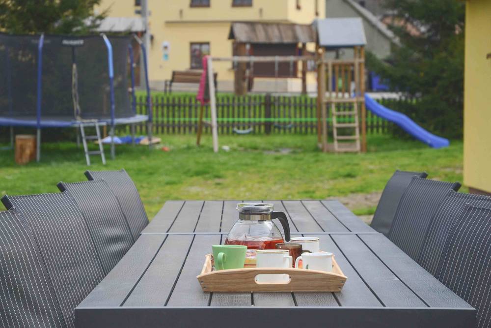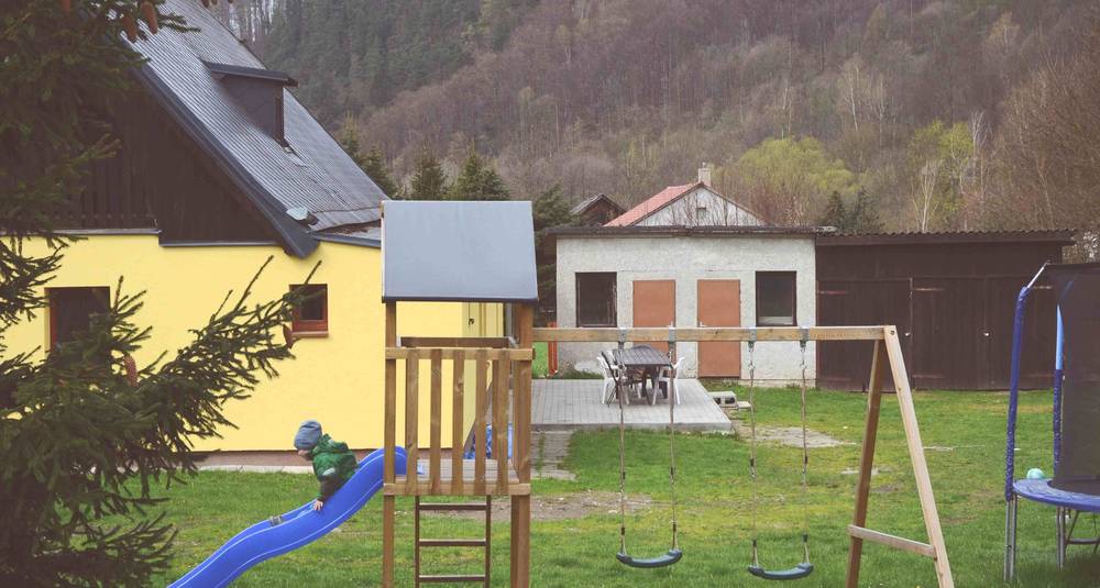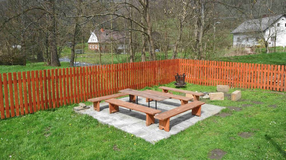 venkovním posezením, ohništěm a dětským hřištěm. Je zde i uzamykatelná