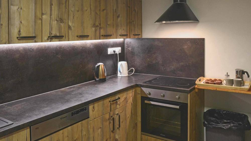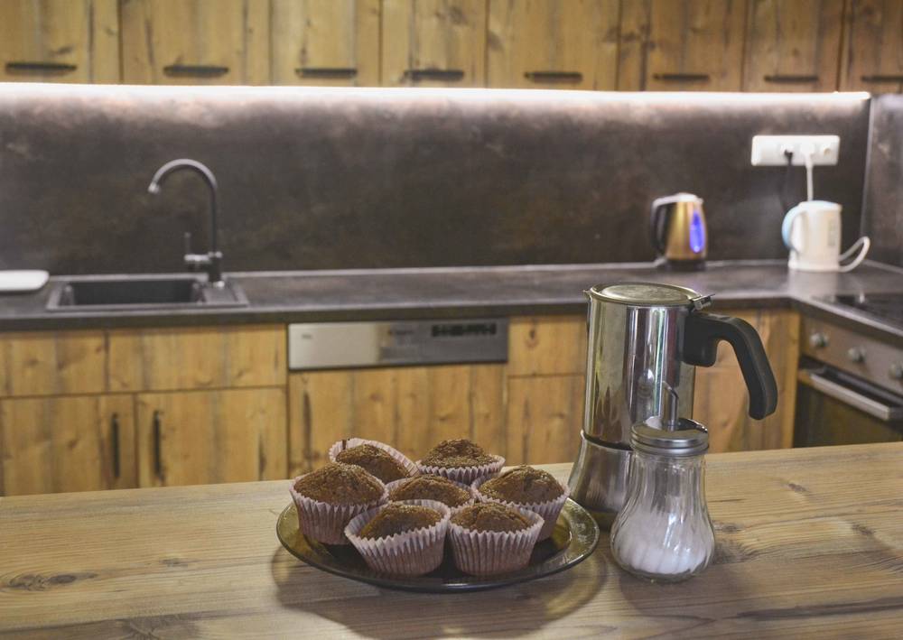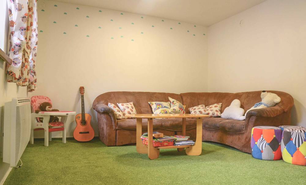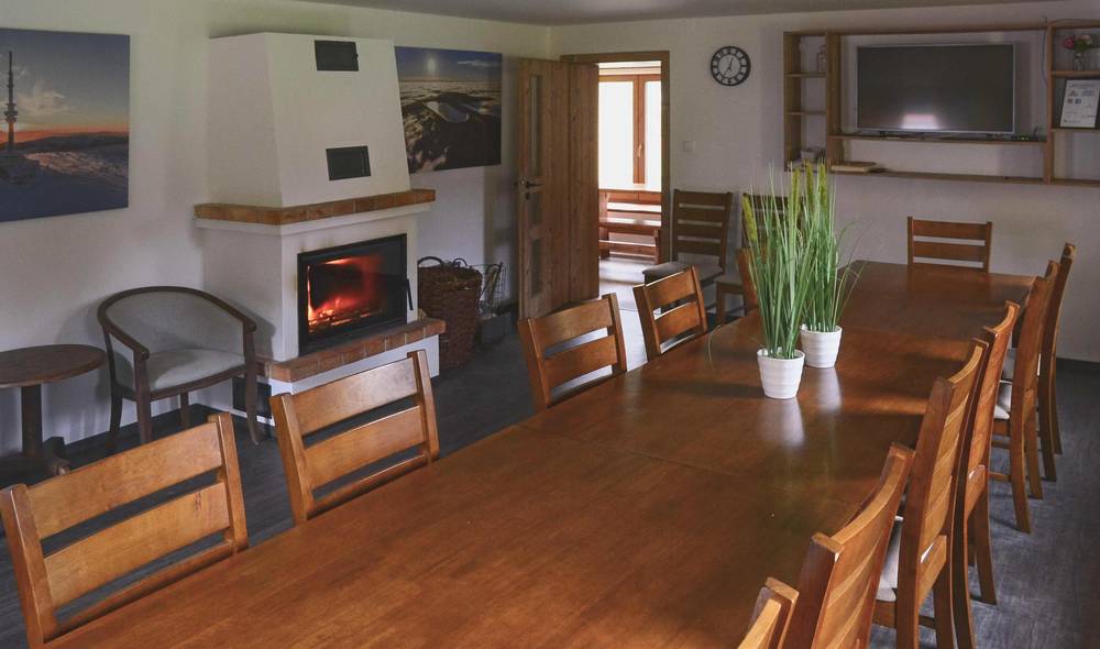 místnost s krbem (dřevo zdarma k dispozici), dětská herna a kuchyně s