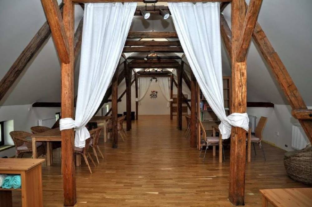 Seminární místnost – prostorná podkrovní místnost nad stájemi, 2x WC, kompletně ozvučená, včetně audio sestavy přehrávající CD a mp3 formáty. Místnost vhodná i pro lehčí formy cvičení (jóga, pilates apod.)