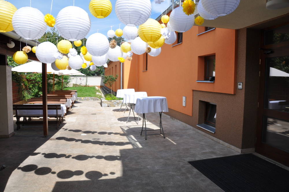 V teplých obdobích jsou k dispozici dvě zahrádky – jedna před domem, druhá ve dvorku hotelu. Speciality domácí i evropské kuchyně.