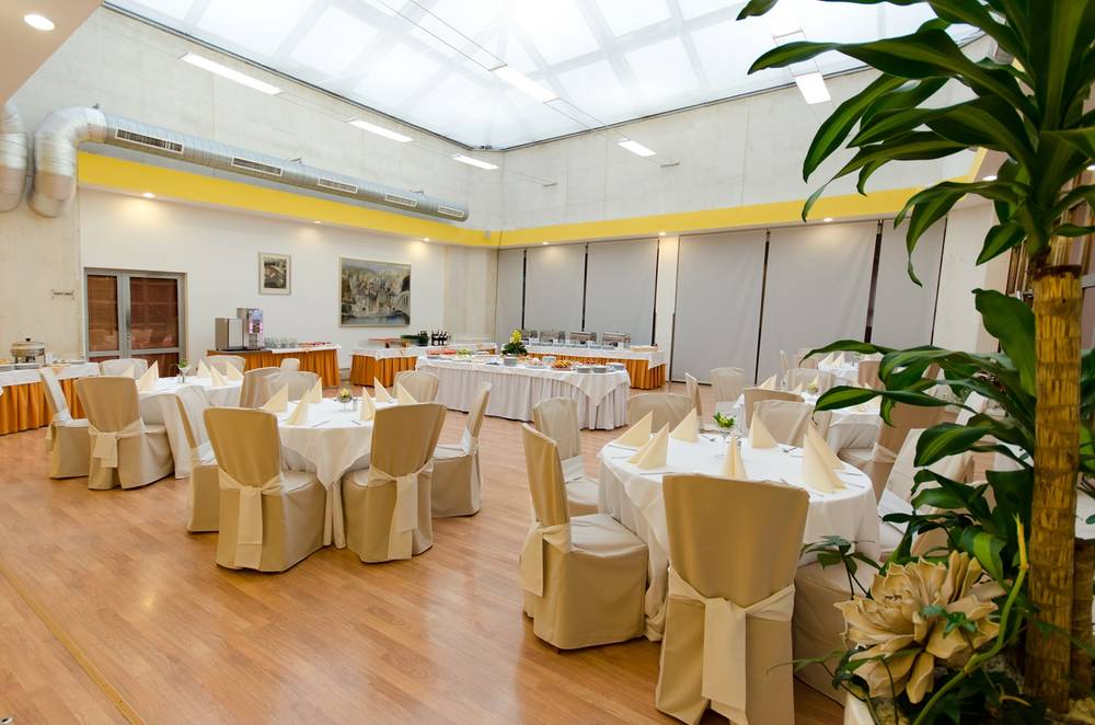 Atriový strop klimatizovaného sálu nabízí jedinečnou možnost příjemně strávených chvil. Nachází se v přízemí hotelu o výměře 100 m2.