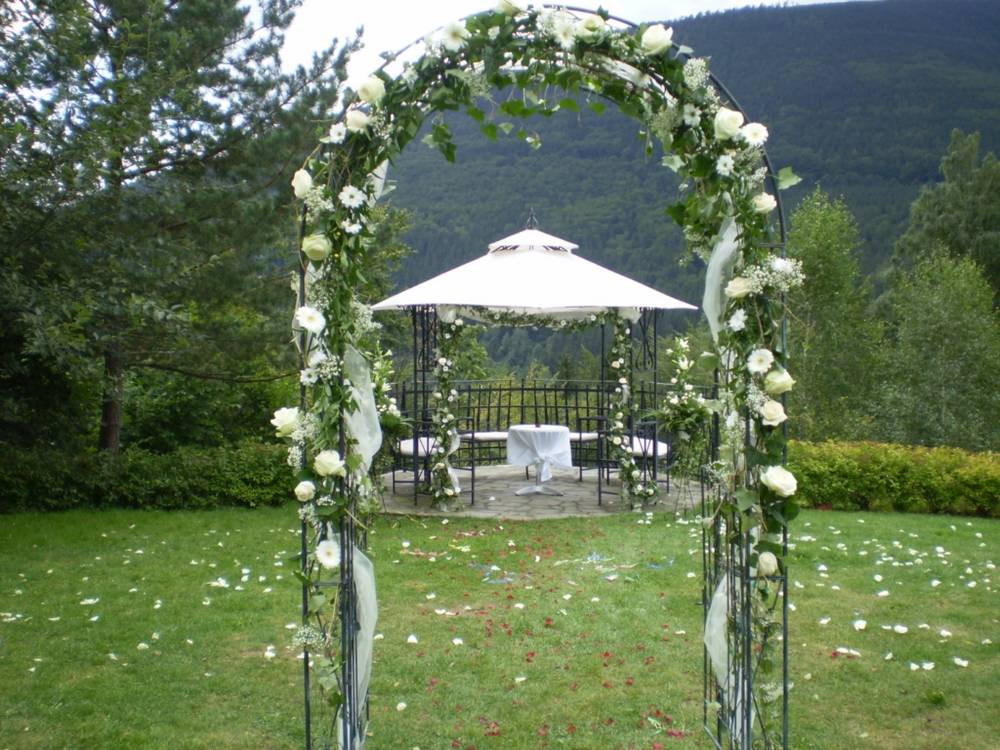 svatební obřad ve svatebním altánu uprostřed hotelové zahrady