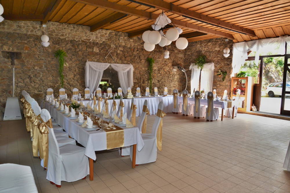 V letním období je možné pořádat cateringové rauty a grill párty i venku v párty stanech. Budete si tak užívat slunce, teplo, vyhlídku na okolí, přírodu na dosah a úžasný prostor hradních teras. Zanedlouho budou mít novomanželé možnost svatebního obřadu také pod svatebním altánkem na terase.