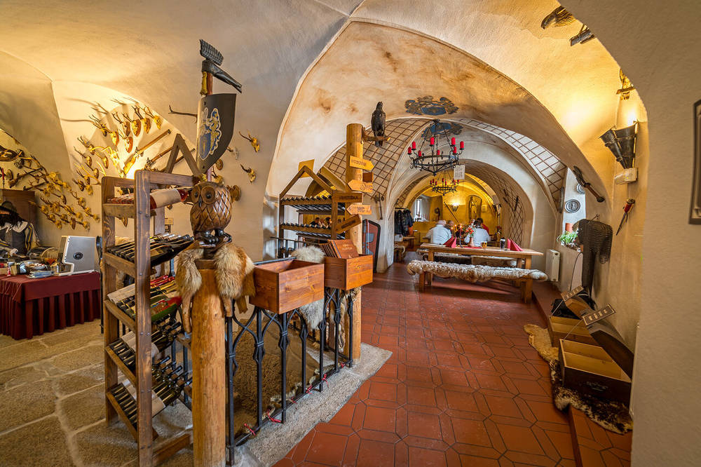 Hradní vinotéka obsahuje nabídku moravských i zahraničních vín.