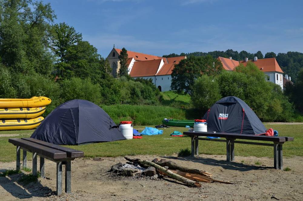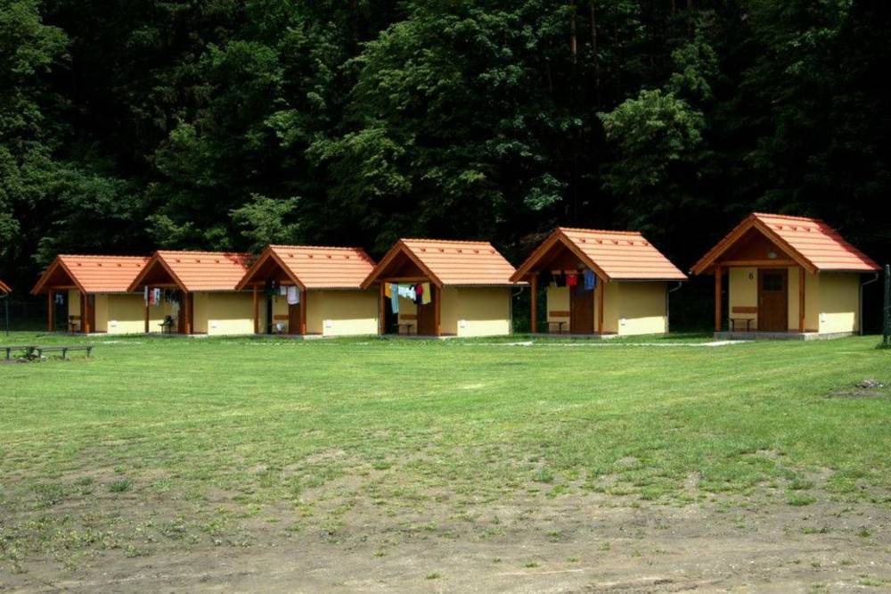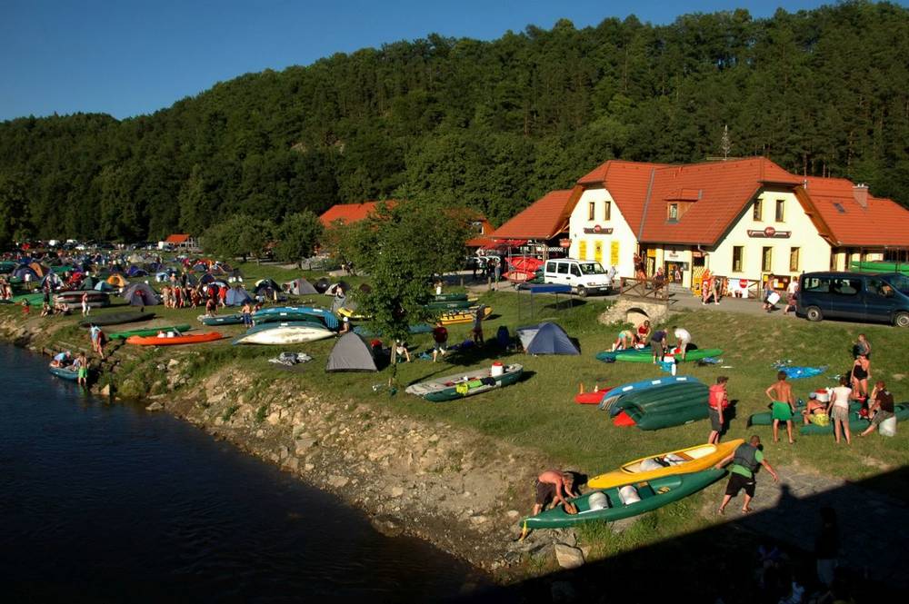 je původní vodácký kemp, který se rozprostírá na pravém břehu řeky Vltavy v obci Zlatá Koruna. Kemp je v provozu od 1. května do 30. září. V hlavní sezóně (červenec, srpen) bývá nejvíce obsazen ve dnech středa, čtvrtek a sobota. Větší skupiny je vhodné objednávat předem. V areálu se nachází velké množství různých druhů občerstvení, které se snaží uspokojit každého návštěvníka. Pod velkou krytou pergolou je až 200 míst k sezení. Součástí objektu je sociální a hygienické zařízení. Jsou zde umístěny umývárny se studenou vodou, 25 splachovacích WC, 7 sprch s teplou vodou opatřených automaty na 20Kč a prostor na umývání nádobí. Pitná voda je samozřejmostí v celém areálu. V naší kuchyni najdete denně čerstvá, hotová, teplá jídla, minutky a polévky.
