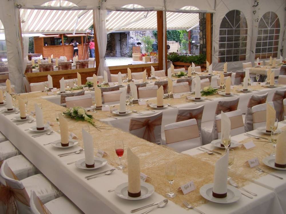 Venkovní posezení od dubna až do listopadu v krytém venkovním stanu (kapacita až 100 osob) s možností přitopení za nepříznivého počasí.