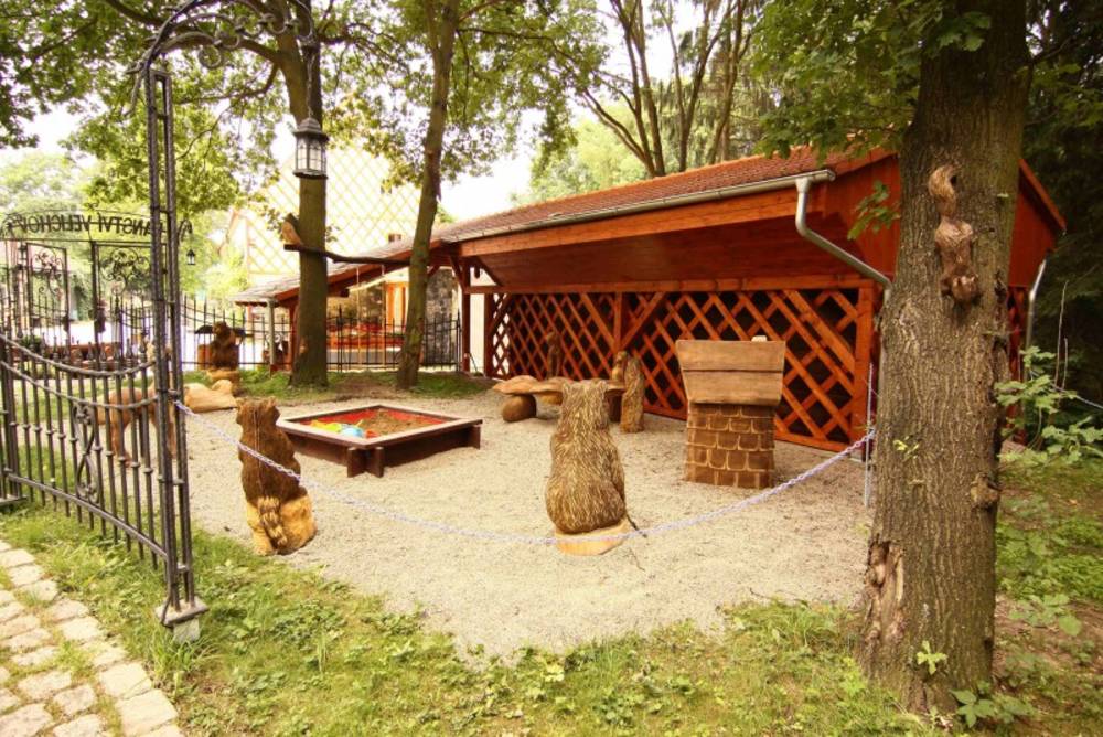 Aby toho nebylo málo, je Vám k dispozici tenisový kurt, kulečník, dámský dobový kočár, jedno z prvních vyrobených aut – Daimler 1895, golfový vozík, historický vláček, na kterém si můžete udělat projížďku po Velichově a pořádně to u nás roztočit. Pro děti jsme postavili dvě nové dětské hřiště.