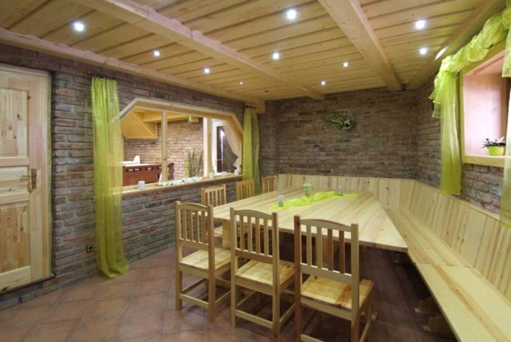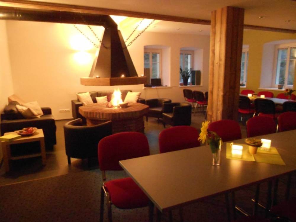 ŠKOLÍCÍ MÍSTNOST -ZELENÁ pro 20 - 30 osob - atypické provedení, skloubení školení a volného času, vybavení moderním nábytkem, který umožňuje naprostou variabilitu při uspořádání místnosti, ale i nábytkem z masívu, dominantou místnosti je otevřené krbové ohniště pro večerní diskuze a posezení, výhled na přilehlou lesní stráň s protékajícím potokem, plocha místnosti 54 m2, využitelných pro školení 38 m2.