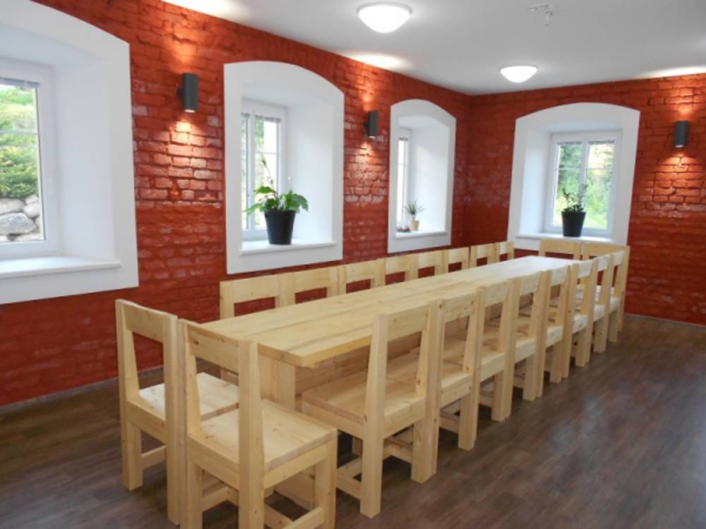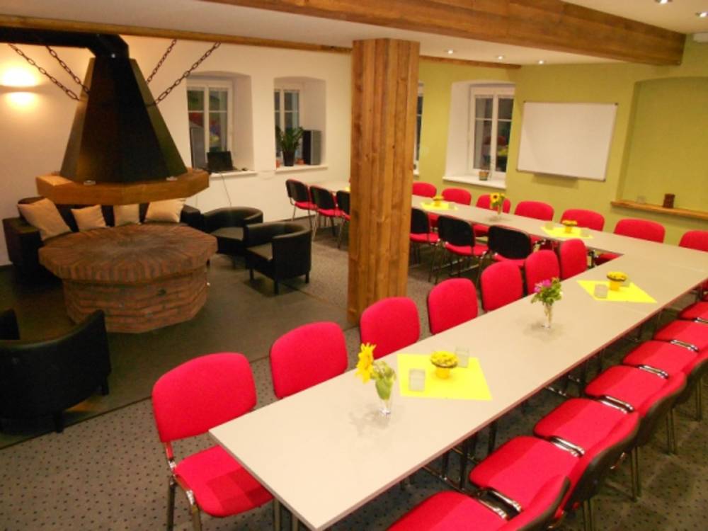 ŠKOLÍCÍ MÍSTNOST-ČERVENÁ pro 10 - 20 osob - velmi příjemné provedení a barevné sladění, vybavení nábytkem z masívu, plocha místnosti 30 m2.
