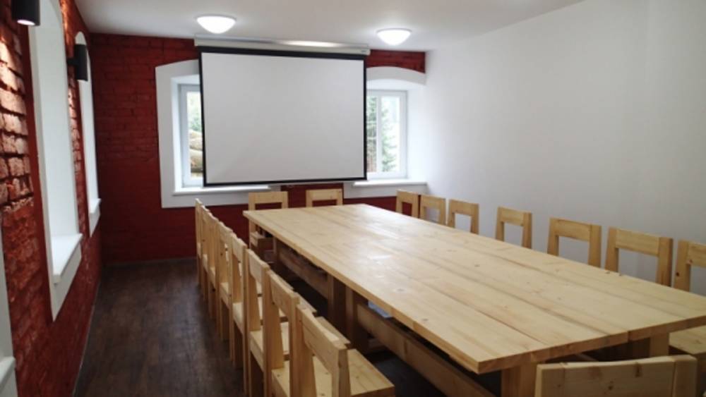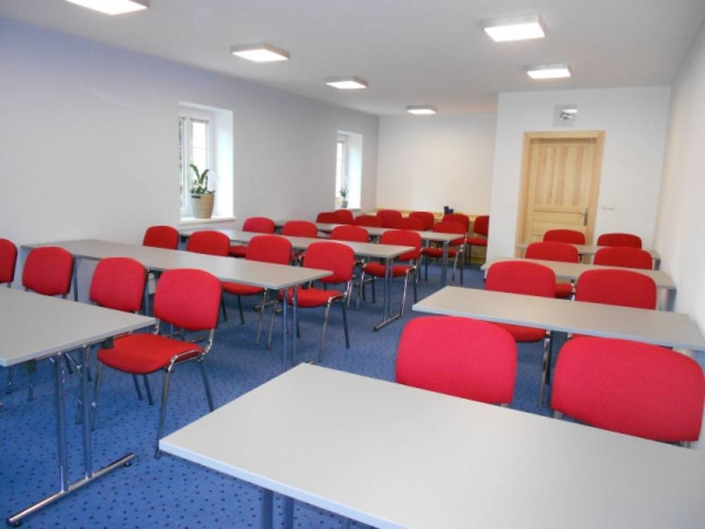 Vybavení školících místností: projektor, projekční plátno 2,45 x 2,60 m, flipchart + fixy, bílá magnetická tabule + magnety, wi-fi připojení