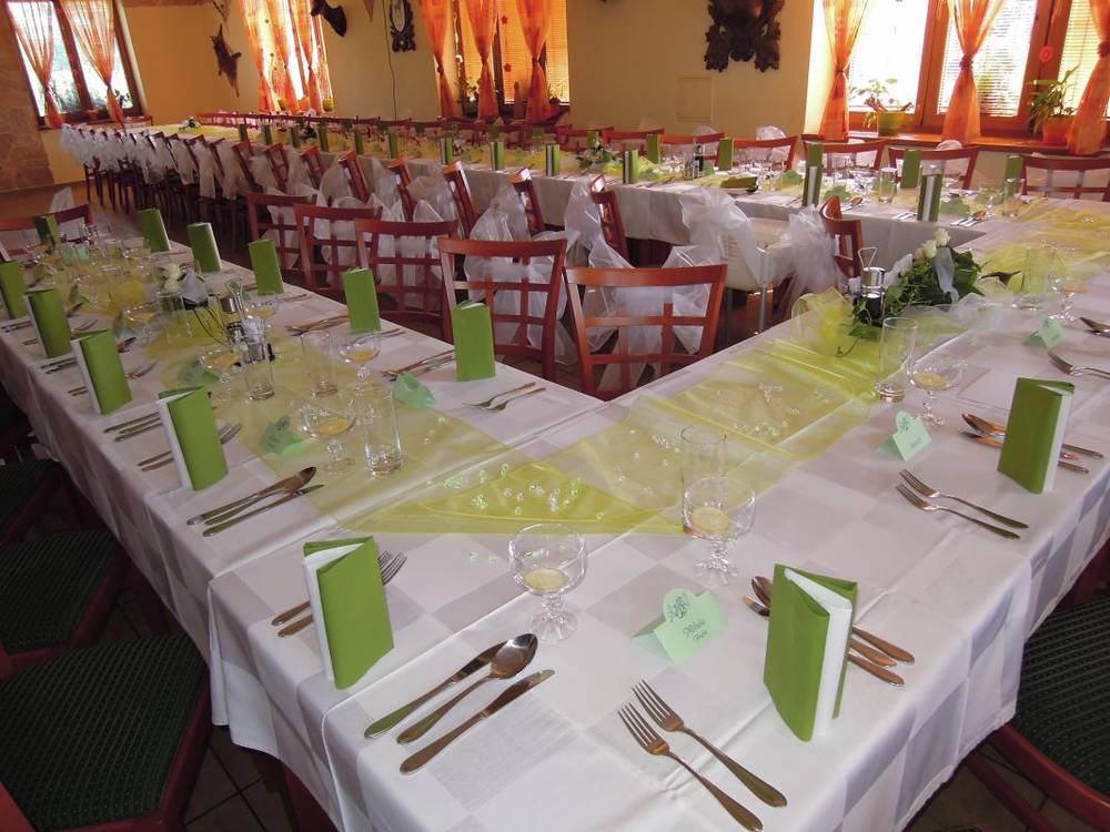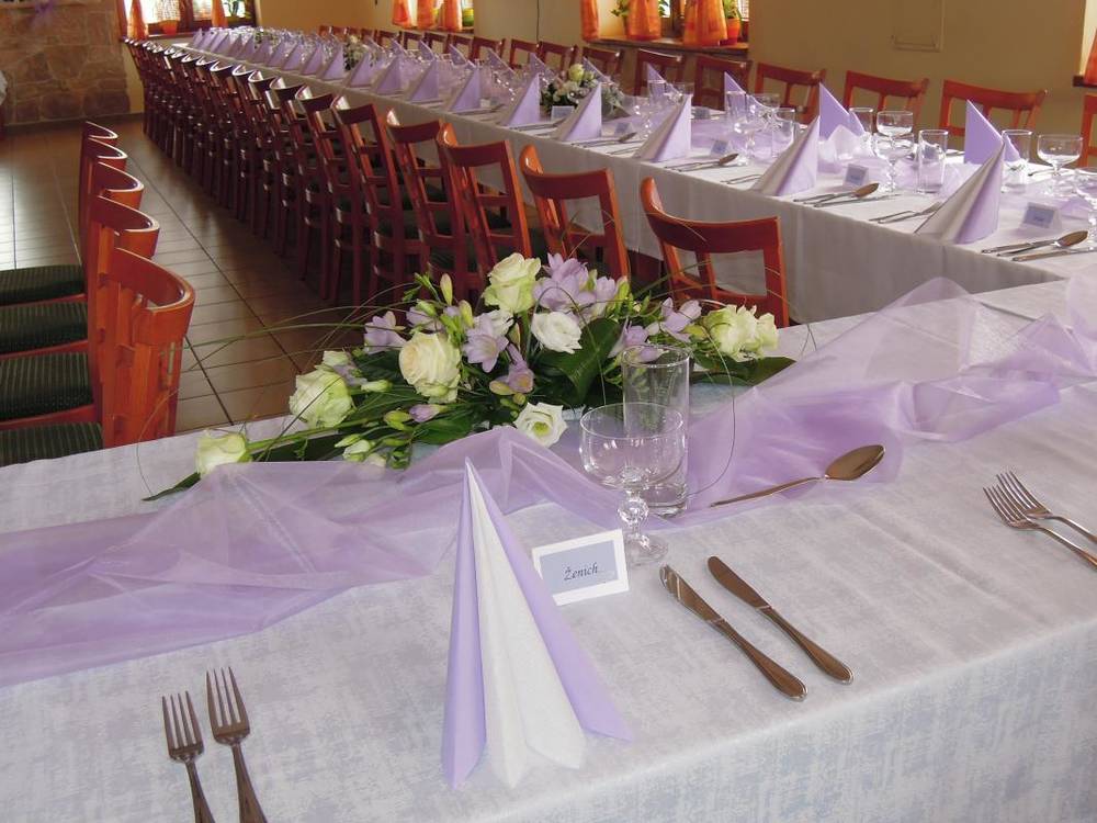 Běžnou výzdobu slavnostních tabulí (ubrusy, dekorativní organzu, ikebany ze suchých květů a papírové ubrousky) poskytujeme zdarma.