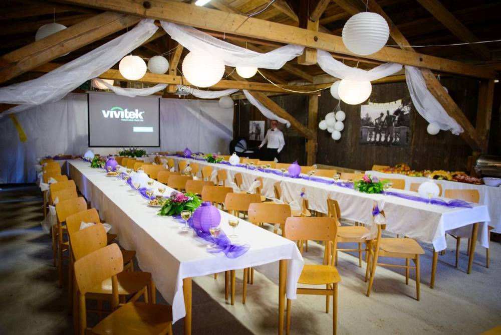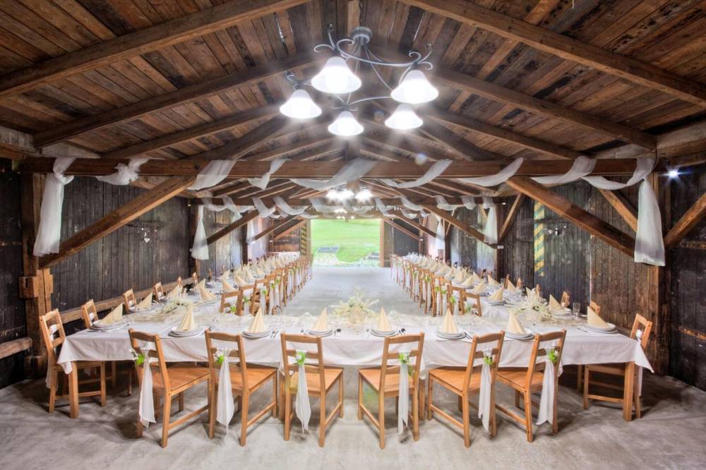 Zrekonstruovanou stáj včetně odděleného zázemí (přípravna pokrmů apod.) s kapacitou až pro 100 osob a to včetně zapůjčení pípy, setu na umývání sklenic, stolů, židlí, veškerého jídelního a nápojového servisu, venkovní ozdobné slavobrány, lavic pro obřad, 5 pivních souprav pro venkovní posezení