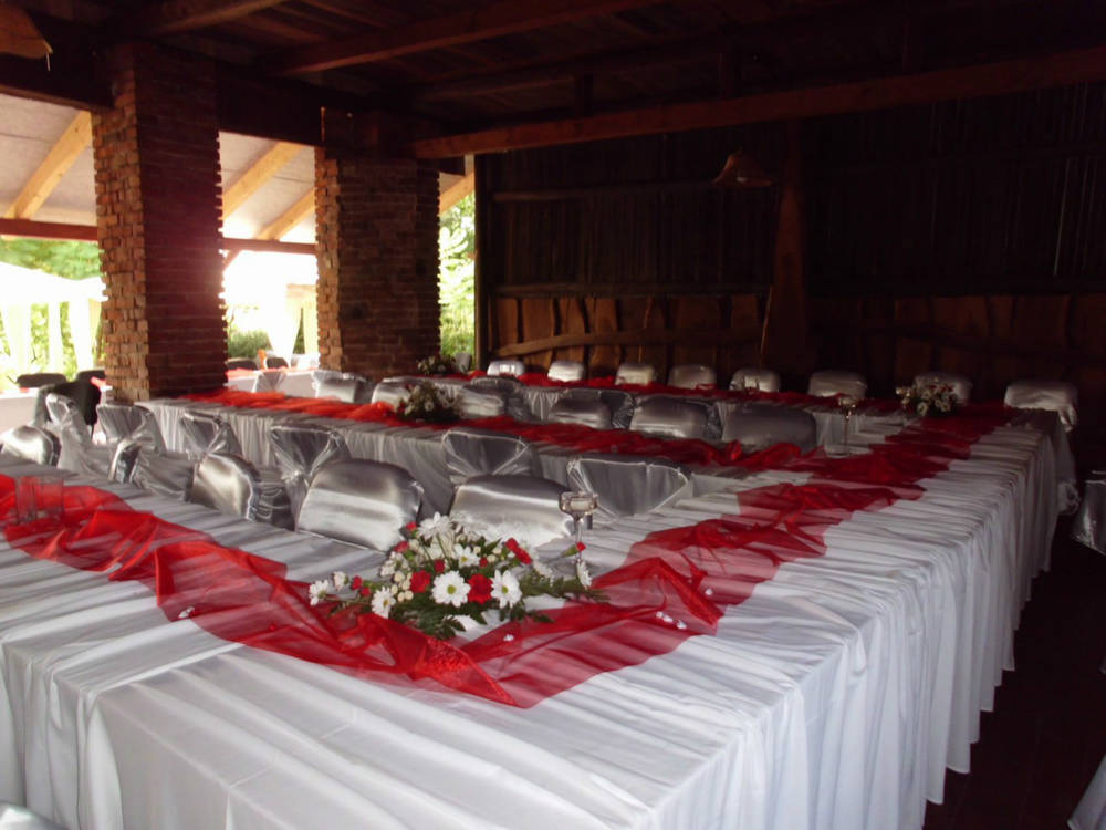 Venkovní prostor zahrady, retro stodolového sálu, altánu lze využít pro svatební hostinu s obřadem , firemní a rodinné oslavy s v vyuřitím saténových potahú židlí univerzální velikost a výzdoby prostor.