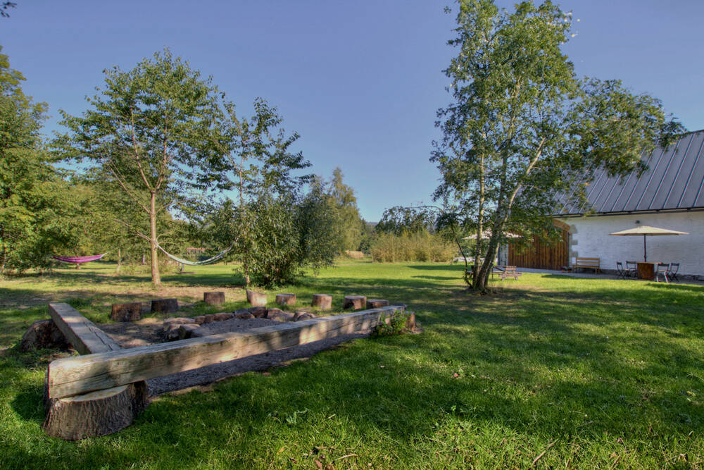 Oplocená zahrada o rozloze 5000 m² nabízí parkoviště pro 30 vozidel a ohniště.