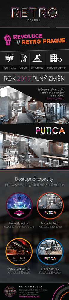 Retro Prague – během léta 2017 proběhne redesign všech prostor, které jsou vhodné na jedinečné firemní akce s kapacitou až pro 1000 hostů. Restaurace Putica By Retro projde kompletním redesignem prostor, prostor bude citlivě doplněn industriálními prvky a netradiční salonek bude upraven tak, aby pokryl kapacitu až pro 40 hostů.