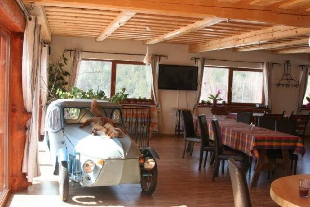 Hlavnímu restauračnímu sálu dominují velké kulaté dřevěné stoly na jedné masívní noze, dřevěné podpůrné sloupy, trámy a točité schodiště vedoucí do podkroví. Mezi velkými okny přitahuje pozornost nádherný kamenný krb s praskajícími poleny. Ten kromě funkce zahřívat příjemně své okolí slouží i ke grilování šunky či přípravě grilovaného kolena přímo před očima hostů. Místnost působí díky svým rozměrům a otevřenému prostoru pod střechou velmi vzdušně, světle a volně.