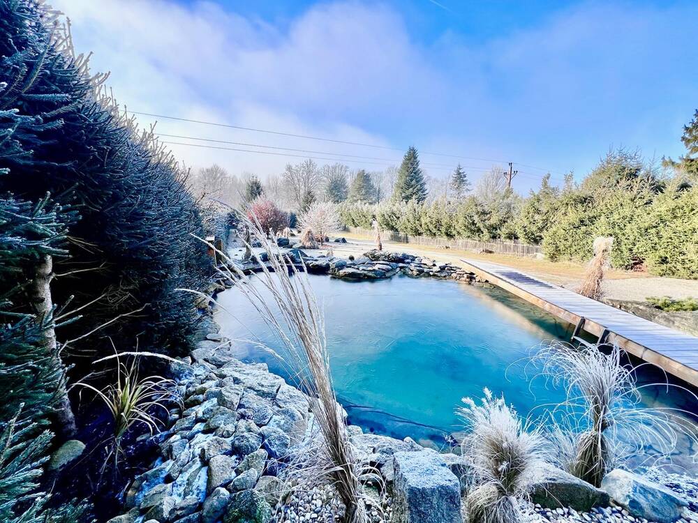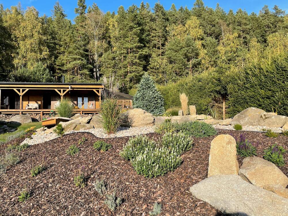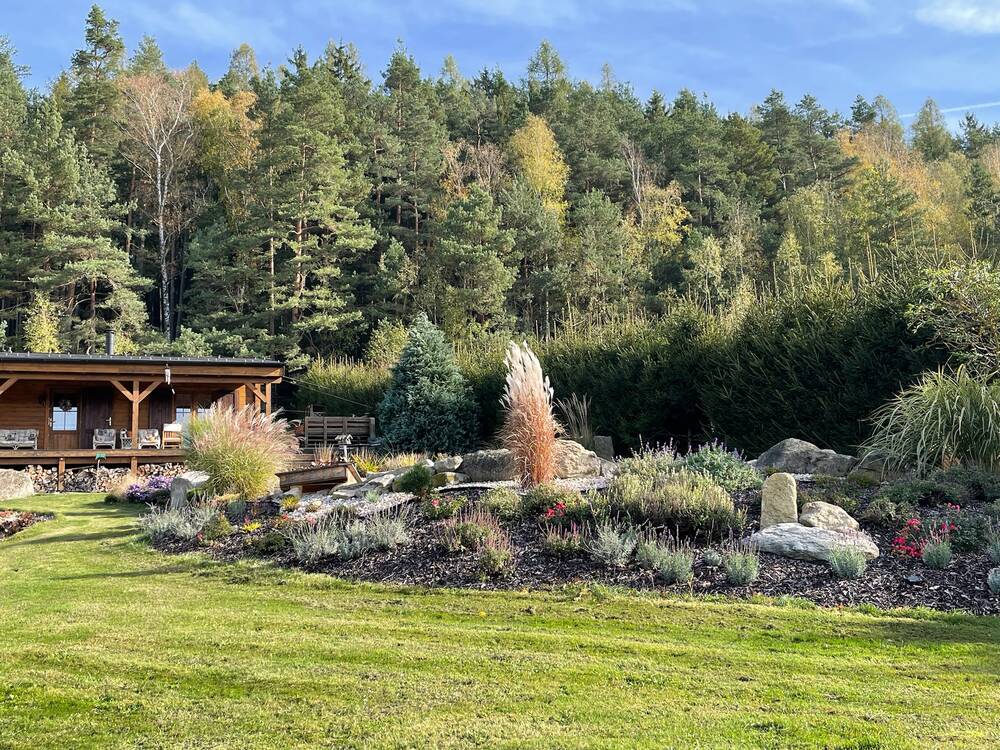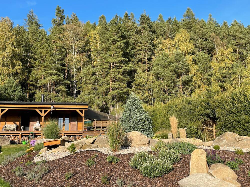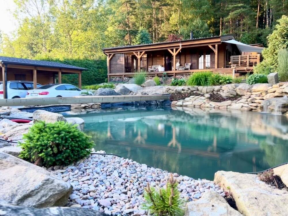 Atmosféra: rustikální dřevo, jezírko, ohniště, les – prostor, který prohlubuje týmovou soudržnost a nabízí inspirativní prostředí mimo rušné město.