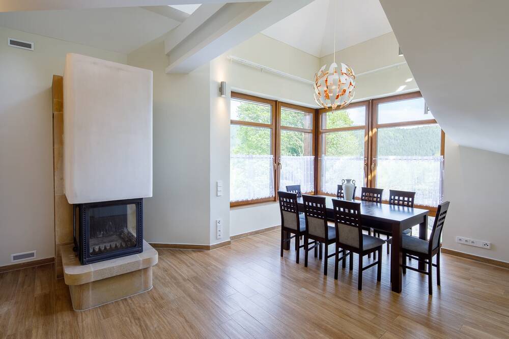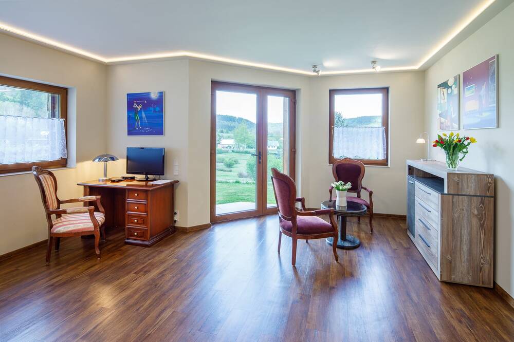 Villa Golf**** je luxusní vila o dvou poschodích, která se nachází v těsné blízkosti budovy Château Cihelny**** (50 m). Objekt se nabízí k pronájmu pouze jako celek. Má vlastní parkování a garáž pro 2 vozy • Check-in probíhá v recepci budovy Château Cihelny a zde se také podávají snídaně. Hostům je tamtéž k dispozici bazén a wellness v ceně pobytu • Villa disponuje čtyřmi dvoulůžkovými pokoji, otevřenou kuchyní a obývacím pokojem • Jeden pokoj je situován v přízemí s východem na terasu, dva pokoje v prvním poschodí a jeden pokoj ve druhém patře. Ložnice ve druhém patře je skvostem celého objektu. Má celoprosklený výhled do údolí a patří k ní velká šatna a nádherná koupelna současně se sprchovým koutem a vanou a také vchod na venkovní soukromou terasu.