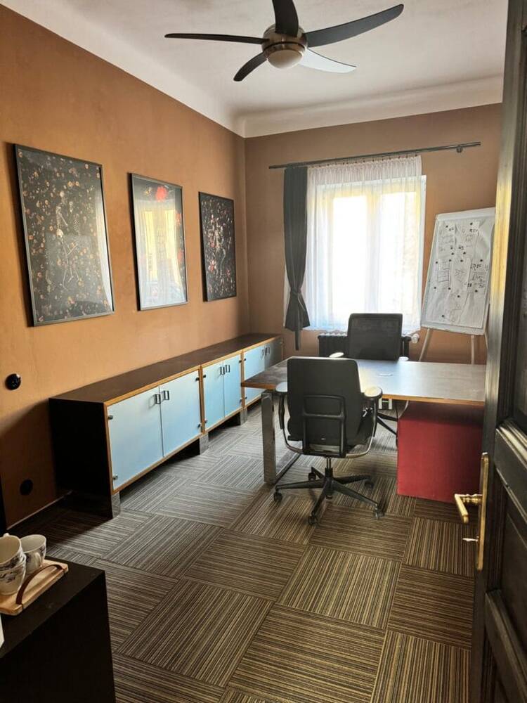 Jednací stůl, flipchart, wifi, středová zásuvka na elektriku na PC ve stole, stropní větrák, kávovar Nespresso Virtuo. 2x kancelářská židle + 2x sedací kostky. Na vyžádání lze vyměnit za 4x Cartell designové plastové židle nebo 6x plastové bílé designové židle s područkami.