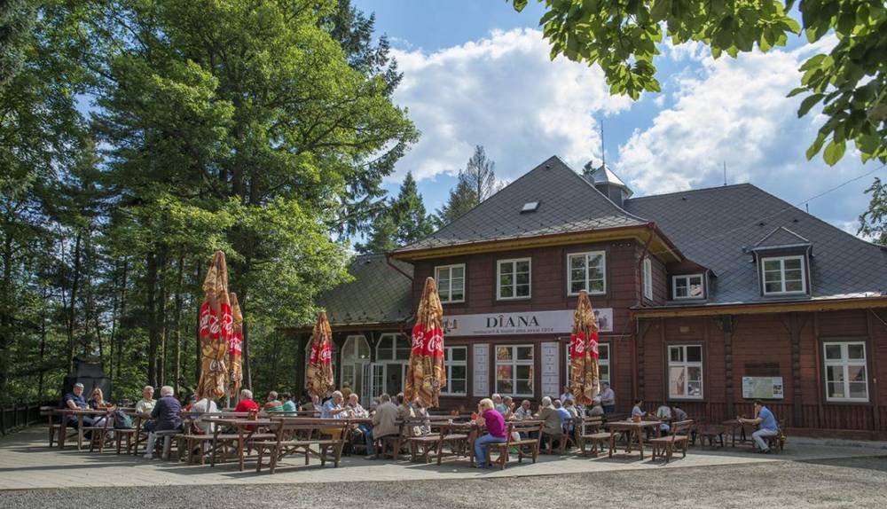 Historická restaurace Diana (postavena r. 1914) se nachází na vrcholu Výšiny přátelství, hned vedle rozhledny, odkud se návštěvníkům nabízí nádherný výhled na Karlovy Vary a široké okolí.