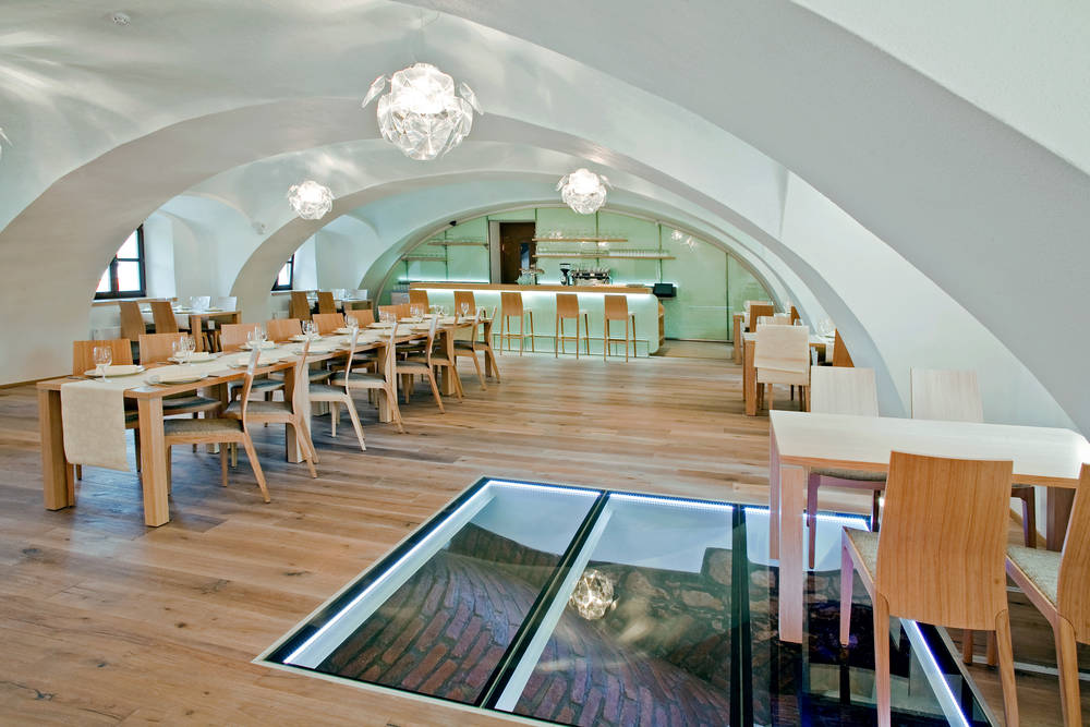 ve dvou nejvyšších poschodích ubytování v osmi komfortních pokojích a jednom apartmá