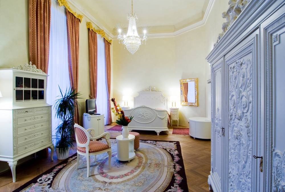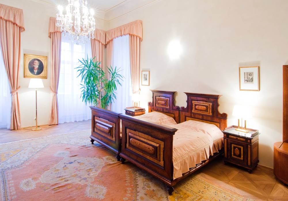 Kromě komfortního vybavení výrazně překračujícího uvedenou kategorii jsou pokoje vybaveny historickým nábytkem.